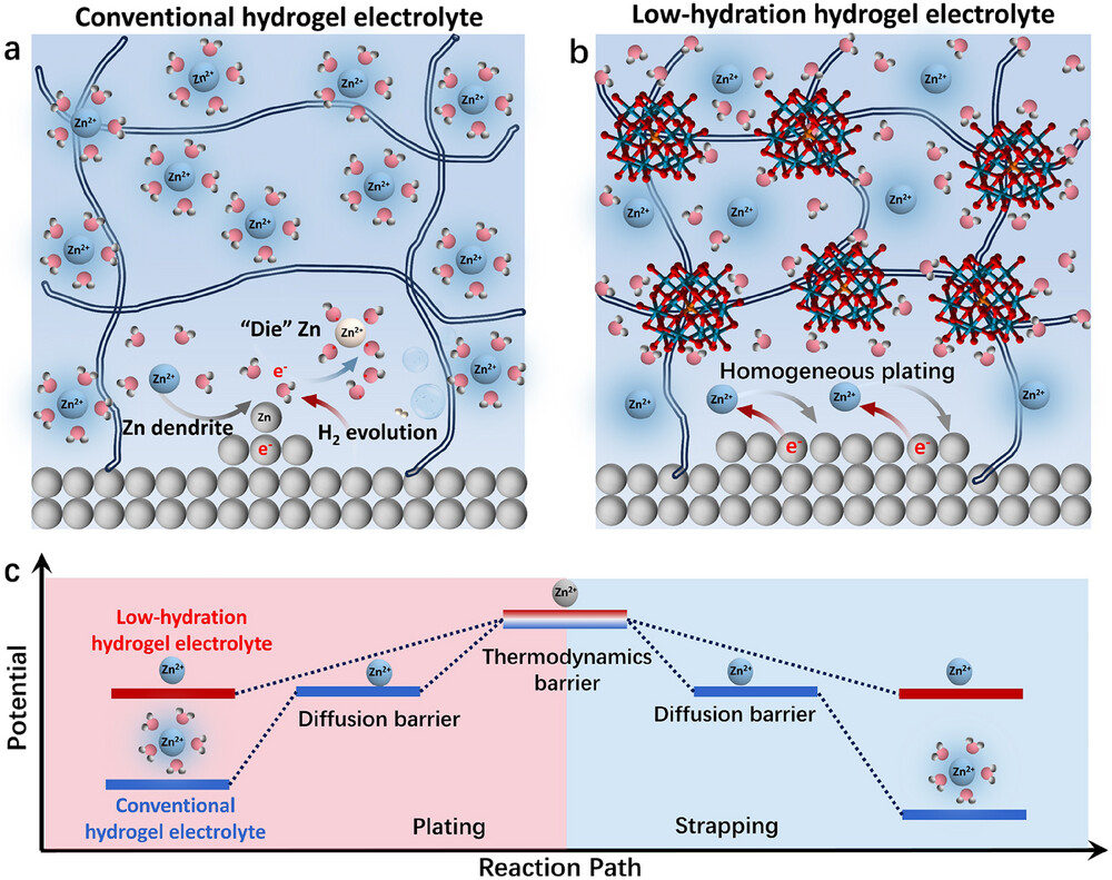 图示1.负极与a)传统水凝胶电解质和b)低水化水凝胶电解质界面处锌沉积行为的机理说明。c)电化学电镀和捆扎过程中低水化和传统水凝胶中锌离子的电位波动。