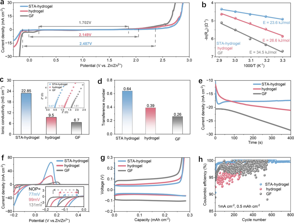 图2. 原始纤维素和STA水凝胶电解质的电化学表征。a)以不锈钢为电极,STA水凝胶电解质、原始水凝胶电解质和液体电解质在1mVs−1下的LSV曲线。b)三种电解质的活化能拟合曲线。c)三种电解质的离子电导率和EIS图(插图)。d)三种电解质的Zn2+迁移数。e)在−150mV偏压下,三种电解质的Zn||Zn对称电池的CA曲线。f)1mVs−1下,三种电解质的Zn||Cu非对称电池的CV曲线。g)三种电解质的Zn||Cu非对称电池在50次循环后的相应电压-容量曲线。h)三种电解质的Zn||Cu非对称电池的库仑效率。