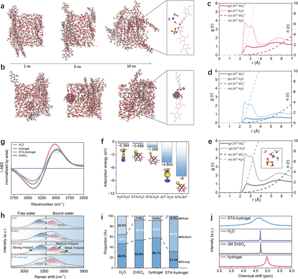 图3. STA水凝胶电解质化学配位结构比较研究。a)原始水凝胶电解质的MD模拟结果。b)STA水凝胶电解质的MD模拟结果。c)原始水凝胶电解质、d)STA水凝胶电解质和e)液体电解质中Zn2+与其他自由基相互作用的相应RDF图。f)STA水凝胶中不同组分之间的吸附能及其对应的电荷密度差图(插图)。g)不同电解质的ATR-FTIR光谱。h)不同电解质的拉曼光谱拟合。i)相应的氢键比例。j)不同电解质的1HNMR光谱。