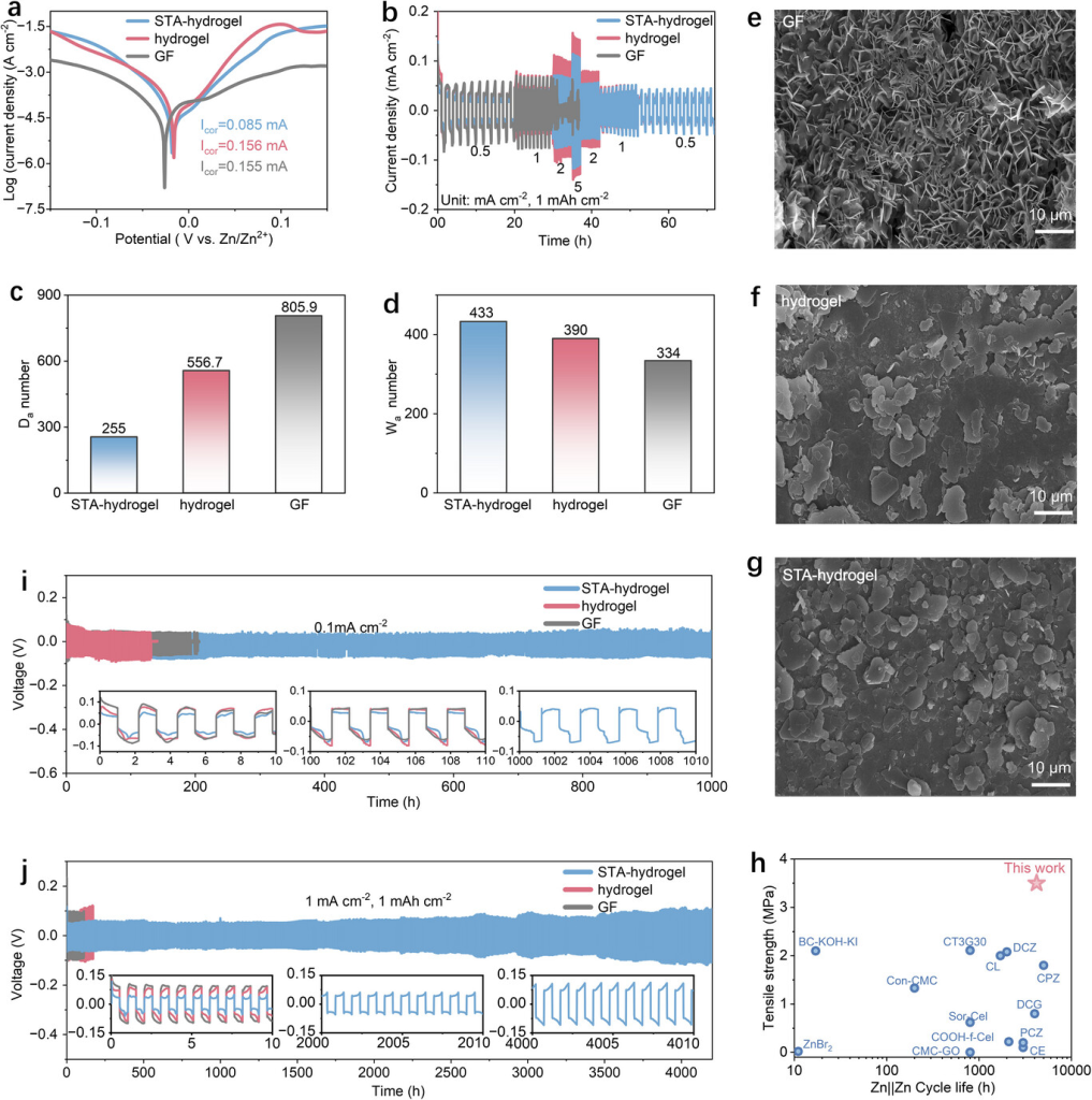 图4. STA水凝胶电解质的电化学电镀测试。a)STA水凝胶电解质、原始水凝胶电解质和液体电解质的Tafel曲线。b)容量为1mAhcm−2时,三种电解质在不同电流密度下的Zn||Zn对称电池的倍率性能。c)Da数。d)Wa数。在e)液体电解质、f)原始水凝胶电解质和g)STA水凝胶电解质的Zn||Zn对称电池中,经过50次循环(1mAcm−2)后的Zn负极的SEM图像。h)机械强度和对称Zn||Zn电池循环稳定性比较。Zn||Zn对称电池在i)1mAcm−2和1mAhcm−2、j)0.1mAcm−2和0.1mAhcm−2下的恒电流循环性能。