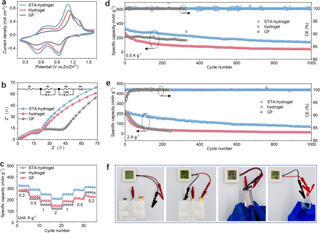 图5. 以V2O5为正极的STA水凝胶电解质的全电池性能。a)三种电解质Zn||V2O5全电池在1mVs−1时的CV曲线。b)三种电解质Zn||V2O5全电池的EIS奈奎斯特图。c)三种电解质Zn||V2O5全电池的倍率性能。d)0.5Ag−1、e)2Ag−1时三种电解质Zn||V2O5全电池的长期循环性能。f)组装后的软包电池柔韧性示意图。