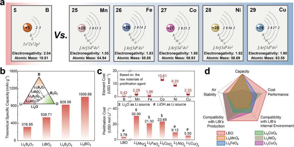 图1.预锂化剂的元素工程设计:a)硼(B)与锰(Mn)、铁(Fe)、钴(Co)、镍(Ni)和铜(Cu)的元素性质和电子轨道比较;b)Li-B-O化合物的理论比容量(插图:Li-B-O相图);c)B和Mn、Fe、Co、Ni和Cu的成本;LBO和其他LROPA的成本;d)比较LBO和其他LROPA的电池相关参数的雷达图。