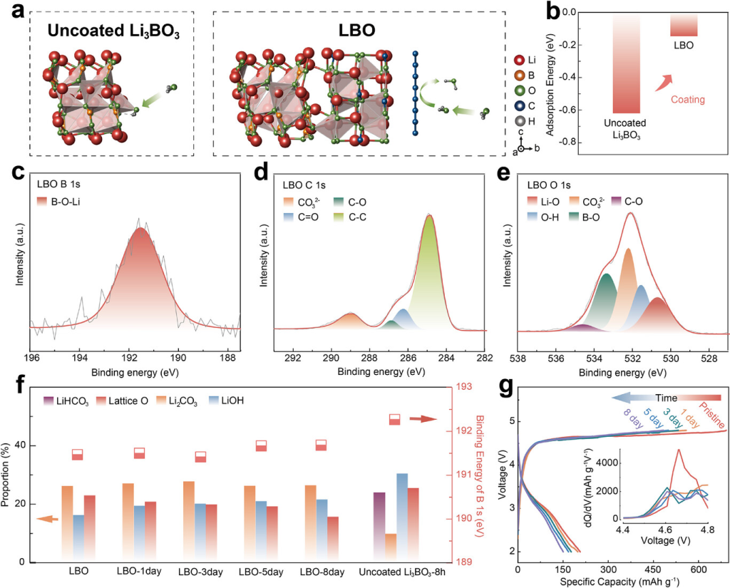图3.LBO的空气稳定性:a)未涂覆的Li3BO3和LBO表面H2O的吸附构型。b)未涂覆的Li3BO3和LBO表面H2O的吸附能;c-e)LBO的XPSB1s、C1s、O1s光谱;f)LBO、老化LBO和未涂覆的Li3BO3-8h的XPS光谱成分分析;f)原始LBO和老化LBO的初始电荷曲线(插入:此图中初始电荷曲线的dQ/dV与V曲线)。