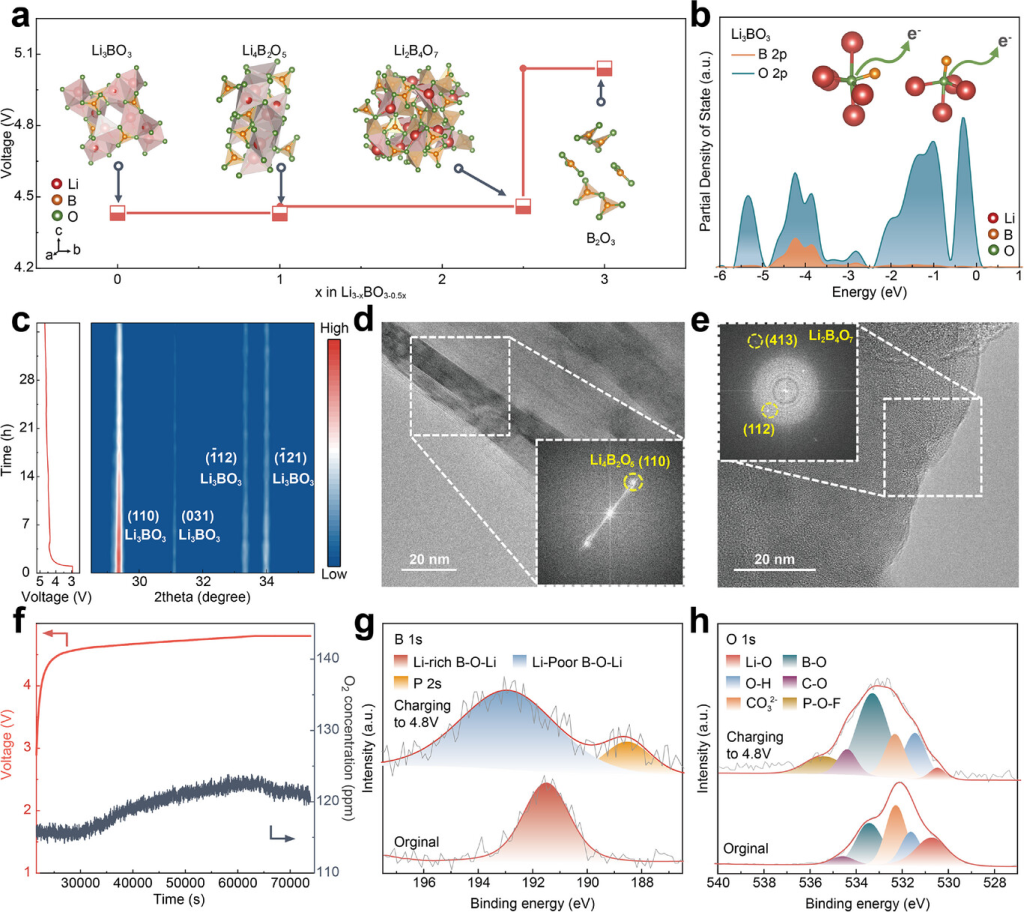 图4.LBO的脱锂机理:a)计算出的Li3BO3的脱锂电位;b)Li3BO3的O和B2p轨道的PDOS;c)LBO初次充电过程原位XRD图衍射峰演变的相应强度等高线图;d∼e)充电20小时后和充满电至4.8V后的LBO的HRTEM图(插图:白色虚线框内区域的FFT图);f)测得的Li||LBO半电池充电过程的电位和O2气体析出曲线;g,h)第一次充电前后LBO的XPSB1s、O1s光谱。