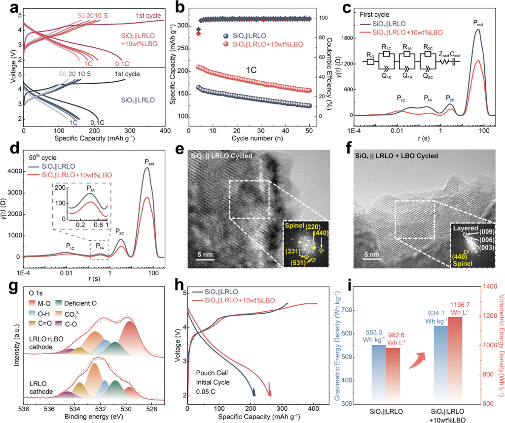 图5. SiOx||LRLO 和 SiOx||LRLO+LBO 全电池的性能:a、b)初始充放电曲线和循环性能;c)首次循环后全电池的 DRT 曲线(插图:等效电路);d)第 50 次循环后全电池的 DRT 曲线(插图:P1A 部分的放大);e、f)全电池中 50 次循环后 LRLO 粒子的 HRTEM 图;g)全电池中 50 次循环后正极的 XPS O 1s 光谱;h)SiOx||LRLO、SiOx||LRLO+LBO 软包电池的初始充放电曲线;i)SiOx||LRLO、SiOx||LRLO+LBO 软包电池的质量和体积能量密度。