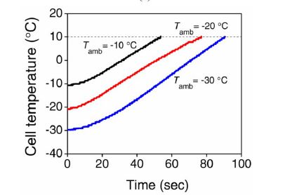 能量消耗, – 30°C至0 °C消耗电池容量的5.5%;-20°C至0°C消耗电池容量的2.9%。文献中对比给出了一组从外部加热的数据,外部加热方法需要约 15分钟和消耗约 10%电量。外部加热有一个好处,能量可以由电池以外的电源提供。