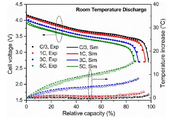 充放电性能,这个参数除了跟自加热有关,跟其电池类型也有关系。电池结构参数如下:以LiNi0.6Co0.2 Mn0.2O2作为正极活性物质,石墨(Nippon Carbon)作为负极活性物质,将1M LiPF 6 溶解于碳酸亚乙酯/碳酸甲乙酯(重量比3:7)中,添加2%亚乙烯基碳酸盐为电解质。隔膜为Celgard-2325微孔三层膜,厚度为25 微米。隔膜具有152×75mm 2,而活性区域(阴极侧)为120×69mm 2 。电芯额定容量为10 Ah,重量为210 g。在室温下以C/3放电,能量密度170Wh/kg。