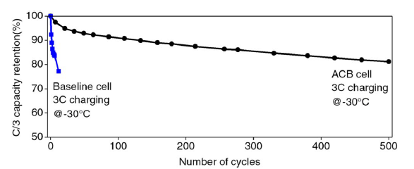 低温循环寿命的测试结论,比较有代表性的关于循环寿命的叙述,3C快速充电到80%SOC在 – 30 ◦可以超过500 次循环。而对照组电池只有12个循环。