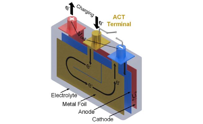在物理结构上,全气候电池除了具有正常的 正负极以外,还增加了一个加热极 ,命名为ACT(activation terminal)。镍箔嵌入电池内部。镍箔的一端焊接在负极端子上,另一端伸出电池外作为激活端子。ACT端子和正极端子之间放置一个温控开关。当电池温度较低并需要快速预热时,开关打开,电流流过镍箔,产生大量内部热量,电池得以被加热到设置温度。温度达到以后,温控开关自动断开。