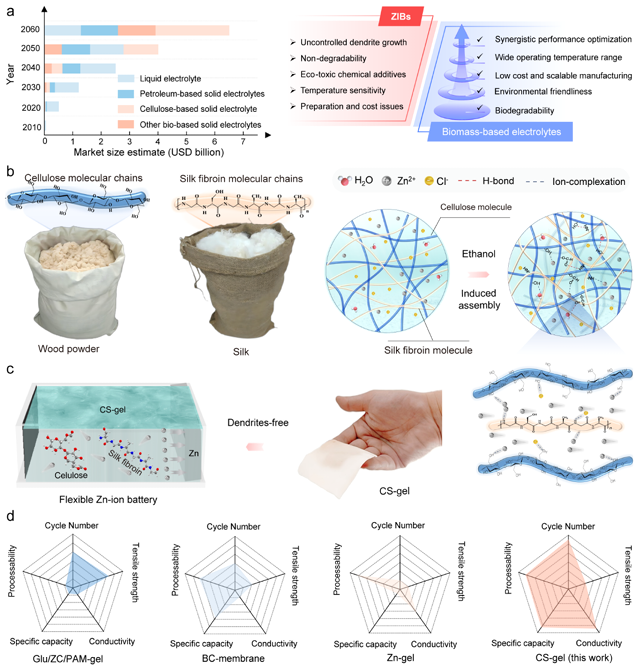 图1.CS-gel的设计与制备。(a)纤维素基电解质作为代表性生物质基电解质的市场需求比较及其在锌离子电池应用中的优势。(b)CS-gel的来源、工作原理、制备及应用。(c)CS-gel的应用领域。(d)CS-gel与同类凝胶电解质性能优势比较。
