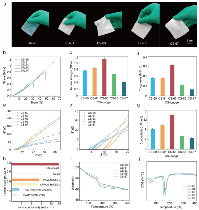 图2.CS-gels优异的机械性能和离子电导率。(a)不同比例下CS-gels的光学图像,显示折叠性、拉伸性和机械耐久性的变化。(b)不同比例下CS-gels的机械拉伸应力-应变曲线。(c)各种CS-gels的拉伸强度比较(条形图)。(d)不同比例下CS-gels的韧性比较。(e)各种CS-gels的电化学阻抗谱(EIS)曲线。(f)EIS曲线的放大视图,以观察与轴和趋势的交点。(g)CS-gels的离子电导率。(h)我们的CS-gels和其他报道的凝胶的机械性能和离子电导率比较。(i)CS-gels的热重(TG)曲线。(j)CS-gels的导数热重(DTG)曲线。