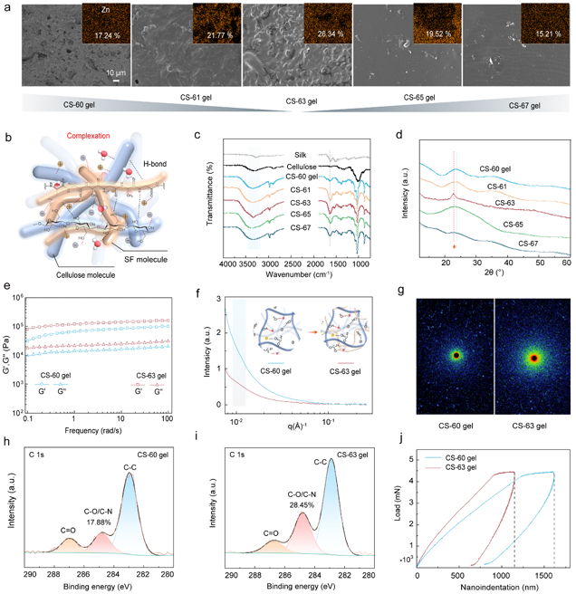 图3.CS-gel的特性和微观结构。(a)各种CS-gel的SEM图像。(b)CS-63凝胶内H-bonding拓扑网络和离子络合效应示意图。(c)不同比例CS-gel的FTIR光谱比较。(d)各种CS-gel的XRD图案。(e)CS-60凝胶和CS-63凝胶的流变性能比较。(f)CS-60凝胶和CS-63凝胶的SAXS曲线。(g)研究CS-60凝胶和CS-63凝胶的2DSAXS图案。(h)CS-60凝胶的C元素高分辨率XPS光谱。(i)CS-63凝胶的C元素高分辨率XPS光谱。(j)CS-60凝胶和CS-63凝胶的纳米压痕测试比较。