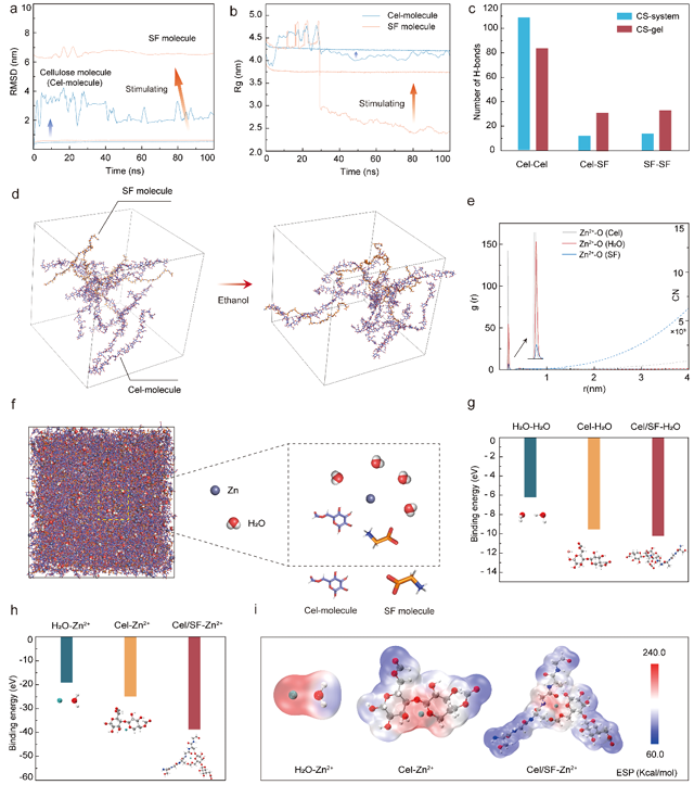 图4.CS-凝胶内超分子构型机理。(a)乙醇蒸汽刺激前后CS-凝胶中纤维素分子和SF分子的RMSD分析。(b)乙醇刺激前后CS-凝胶中纤维素分子和SF分子总Rg比较。(c)CS-凝胶MD模拟的H键数量统计数据。(d)CS-凝胶的MD模拟快照。(e)CS-凝胶中Zn2+离子的RDF图。(f)CS-凝胶MD模拟的溶剂化结构快照。(g)计算出的H₂O单键H₂O、Cel-H₂O和Cel/SF-H₂O的结合能。(h)计算出的H₂O-Zn₂+、Cel-Zn₂+和Cel/SF-Zn₂+的结合能。(i)CS-凝胶中代表性溶剂化结构的静电势分布图。
