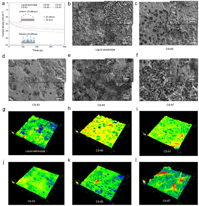图5.研究对称电池性能。(a)上述对称电池的计时电流曲线。(b-f)使用纤维素膜/液体电解质、CS-60凝胶、CS-63凝胶、CS-65凝胶和CS-67凝胶的Zn//Zn对称电池中Zn电极在0.5mAcm⁻²下循环后的SEM图。(g-l)使用纤维素膜/液体电解质、CS-60凝胶、CS-61凝胶、CS-63凝胶、CS-65凝胶和CS-67凝胶的Zn//Zn对称电池中Zn电极在0.5mAcm⁻²下循环后的激光扫描共聚焦显微镜(LSCM)图。