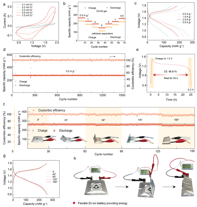 图6.基于CS-63凝胶的柔性锌离子电池。(a)电池的循环伏安(CV)曲线。(b)基于CS-63凝胶和纤维素隔膜的两种柔性锌离子电池分别从0.5C到5C额定容量的比较。(c)电池的恒电流充放电(GCD)曲线。(d)0.5C电流密度下的长期循环稳定性测试。(e)在CS-63凝胶中以100%充电状态静置24小时后对电池的储存性能进行评估。(f)不同弯曲角度下的循环性能测试。(g)不同弯曲角度下的电池充放电曲线。(h)在弯曲条件下持续为LED灯泡供电的柔性锌离子电池的光学照片。