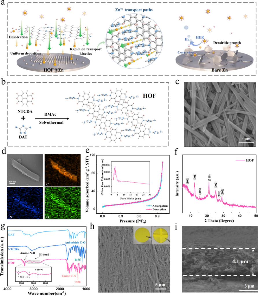 图1.(a)HOF@Zn和Zn负极上Zn沉积的示意图。(b)合成HOF的分子结构。(c)SEM图,(d)元素分布,(e)氮吸附和解吸及孔径分布曲线,以及(f)HOF的XRD。(g)DAT、NTCDA和HOF的FTIR。(h)HOF@Zn的顶视SEM图和(i)侧视SEM图。