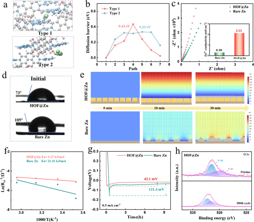 图2.(a)HOF结构内两种Zn2+传输路径概览。(b)HOF中两种Zn2+传输路径的扩散势垒。(c)锌离子的阻抗谱和计算电导率。(d)水在HOF@Zn和裸Zn负极上的接触角。(e)不同时间后HOF@Zn和裸Zn的Zn离子浓度分布。(f)HOF@Zn和裸Zn负极的界面反应活化能。(g)HOF@Zn和裸Zn负极上Zn沉积的成核过电位。(h)循环前后HOF@Zn的O1sXPS