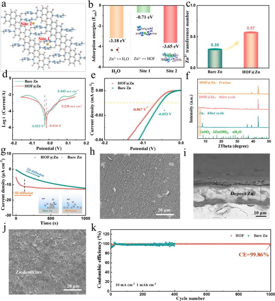 图3.(a)HOF结构中吸附Zn2+的选定位点概览。(b)HOF在两个位点对Zn2+的吸附能以及H2O分子对Zn2+的吸附能。插图展示了HOF的侧视图优化结构。(c)HOF@Zn和裸Zn负极的Zn2+迁移数。(d)HOF@Zn和裸Zn负极的Tafel曲线和(e)LSV曲线。(f)裸Zn和HOF@Zn负极在不同阶段的XRD。(g)HOF@Zn和裸Zn负极的CA曲线。(h)10mAhcm–2Zn沉积后HOF@Zn负极的表面和(i)截面SEM图。(j)10mAhcm–2Zn沉积后裸Zn负极的表面SEM图。(k)HOF@Zn和裸Zn负极的库仑效率稳定性。