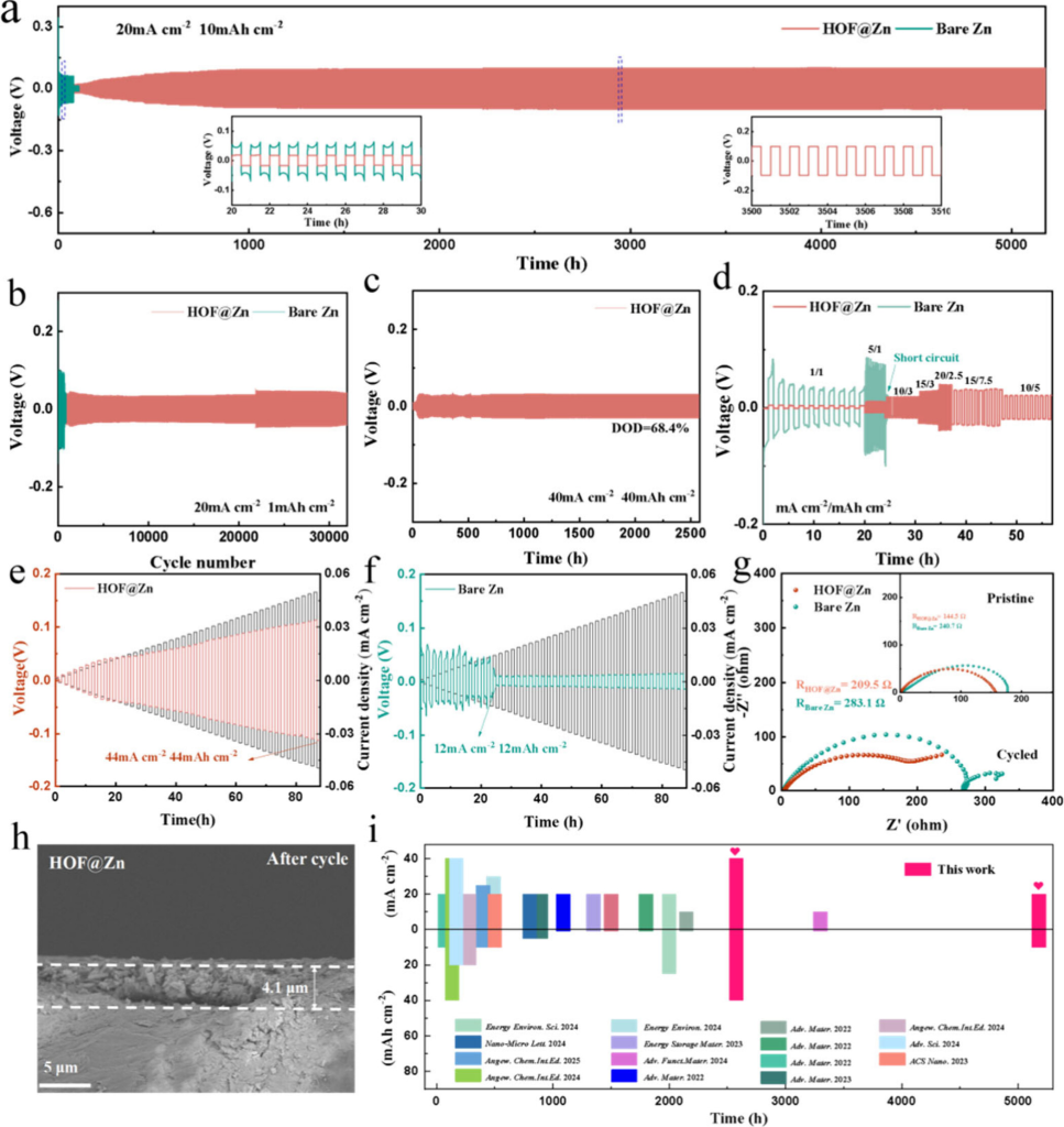 图4.HOF@Zn和裸Zn对称电池在(a)20mAcm–2、10mAhcm–2和(b)20mAcm–2、1mAhcm–2下的循环稳定性。(a)中的插图为不同循环阶段的电压-时间曲线。(c)HOF@Zn对称电池在40mAcm–2和40mAhcm–2下的循环稳定性。(d)HOF@Zn和裸Zn对称电池的倍率性能。(e)HOF@Zn和(f)裸Zn的CCD,电流密度增加1mAcm–2。(g)HOF@Zn和裸Zn对称电池循环前后的EIS。(h)100次循环后HOF@Zn的截面SEM图。(i)本研究与已发表文献之间的性能比较。
