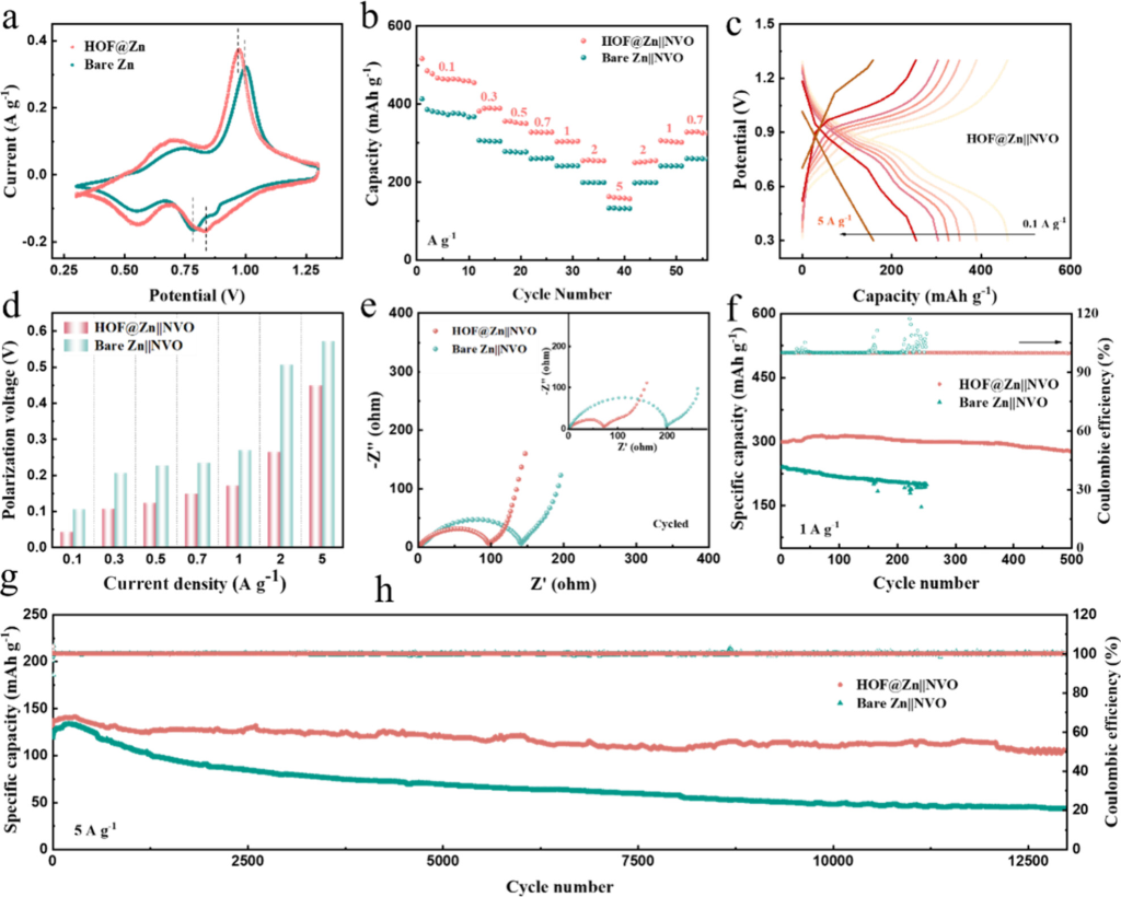 图5.(a)HOF@Zn||NVO和裸Zn||NVO电池的CV曲线和(b)倍率性能。(c)HOF@Zn||NVO电池在不同电流密度下的放电/充电曲线。(d)HOF@Zn||NVO和裸Zn||NVO电池在不同电流密度下的极化电压。(e)HOF@Zn||NVO和裸Zn||NVO电池循环前后的EIS光谱。HOF@Zn||NVO和裸Zn||NVO电池在(f)1Ag–1和(g)5Ag–1下的容量稳定性。