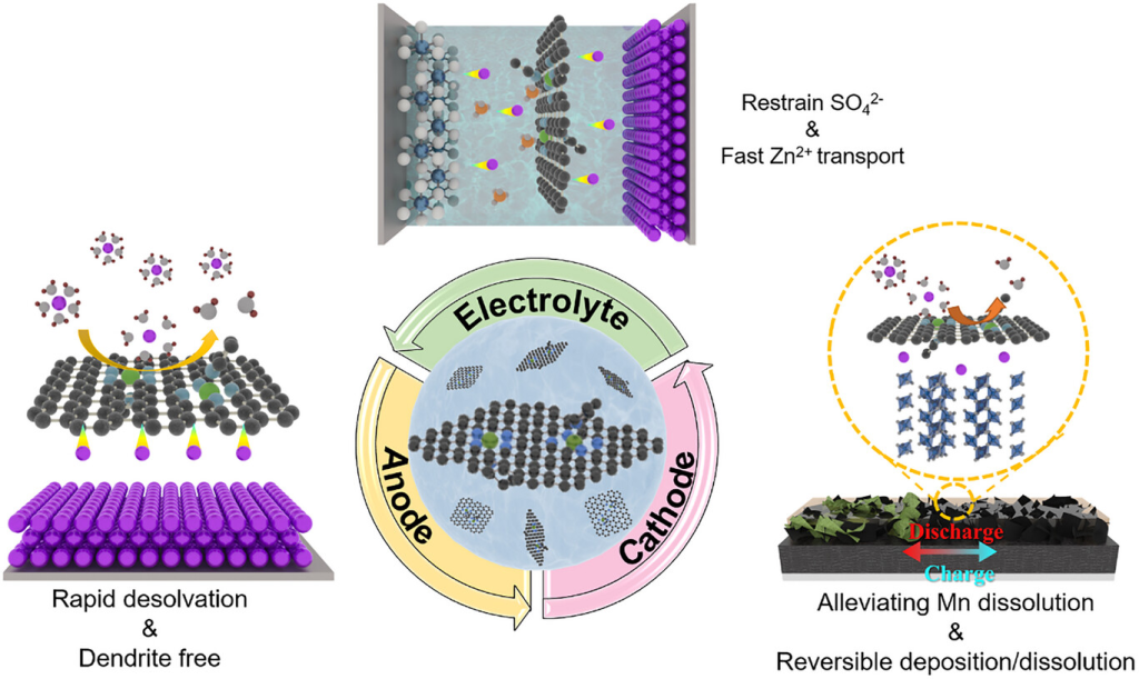 负极、电解液、正极是决定水系锌离子电池性能的关键部件,然而实际应用中它们各自存在不足,现有的策略大多侧重于单一组分,无法实现整体的均衡调控。本文提出了一种具有“级联调控”能力的多功能Fe-N-C悬浮电解质设计新理念。该Fe-N-C悬浮介质充分整合了不同活性位点的优势,相互协同,实现负极、电解液、正极的级联调控。具体而言,其功能包括通过路易斯酸碱相互作用固定SO42−、缓解Zn负极界面的浓差极化、促进去溶剂化、抑制Mn溶解以及副产物的可逆沉积-溶解。得益于这些协同效应,Zn对称电池在1mAcm−2和1mAhcm−2的条件下实现了高达3700小时的循环寿命,并表现出高度可逆的沉积/剥离行为。此外,组装后的Zn-MnO2电池在1Ag−1的电流密度下经过1000次循环后,容量仍保持194.9mAhg−1(容量保持率比纯ZSO体系高2.6倍)。这种通过组分间协同作用实现级联调控的策略,为高性能水系锌离子电池开辟了新的途径。