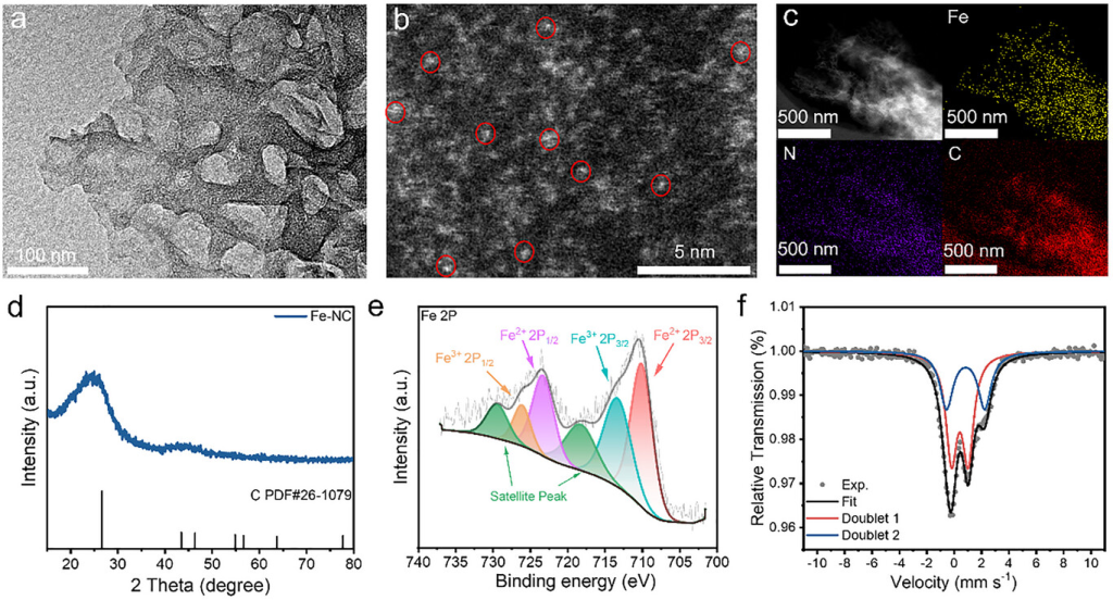 图1. a)HRTEM图、b)HAADF-STEM图、c)暗场STEM图和相应的Fe-NC元素映射。d)XRD、e)Fe2pXPS、f)Fe-NC的57FeMössbauer光谱。