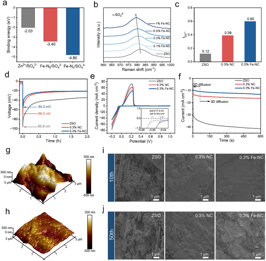 图2. a)SO42−在Zn2+和Fe单原子上的吸附能。b)SO42−伸缩振动的拉曼光谱。c)ZSO、0.3%NC和0.3%Fe-NC 电解液的Zn2+迁移数。d)Zn/Zn对称电池,ZSO、0.3%NC和0.3%Fe-NC 电解液的成核过电位。e)在0.2mVS−1处记录的CV曲线,插图比较了这三种 电解液中Zn2+的成核过电位。f)在−150mV过电位下ZSO、0.3%NC和0.3%Fe-NC 电解液的CA。分别在g)ZSO和h)0.3%Fe-NC 电解液中以5mAcm−2循环50次后Zn箔的AFM图。在1mAcm−2和1mAhcm−2下经过i)10次和j)50次循环后,ZSO、0.3%NC和0.3%Fe-NC 电解液中的Zn电极的FESEM图。