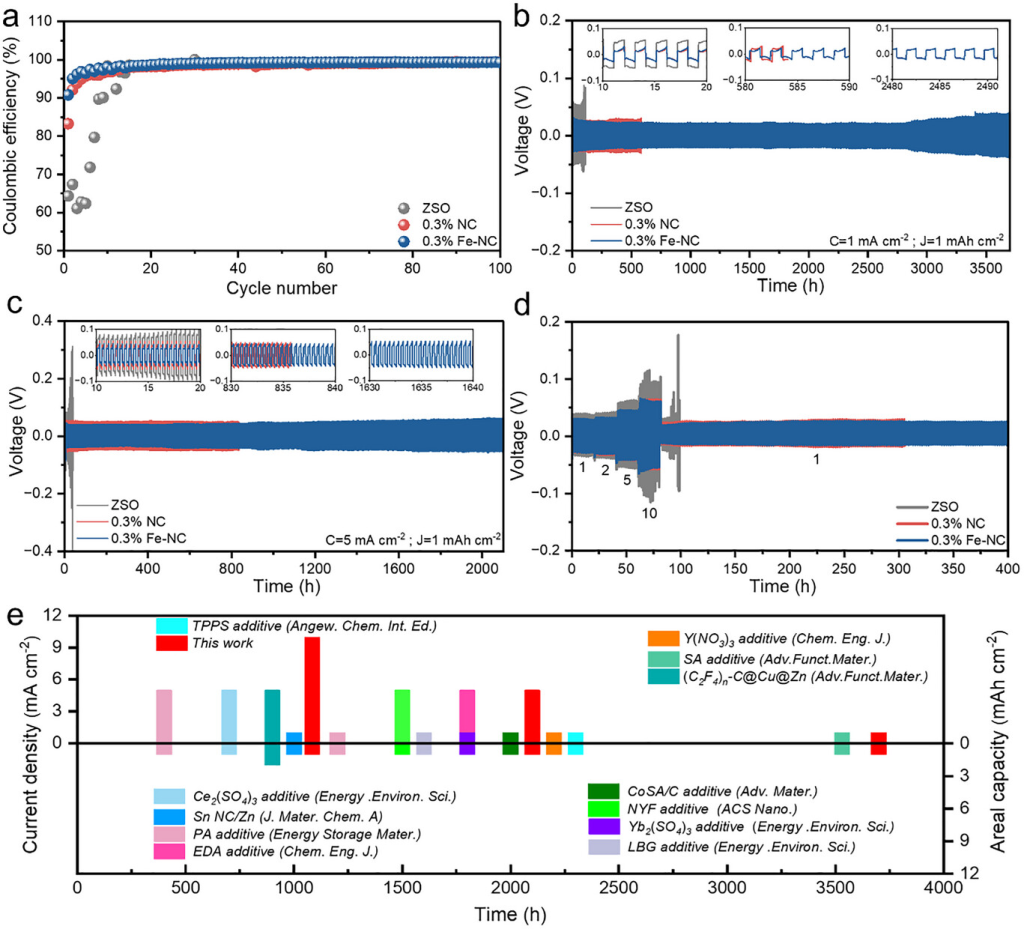 图3. a)基于ZSO、0.3%NC和0.3%Fe-NC 电解液的Zn/Cu非对称电池在1mAcm−2和1mAhcm−2下的库仑效率测试。通过施加电流密度和面积容量b)1mAcm−2(1mAhcm−2)和c)5mAcm−2(1mAhcm−2)在ZSO、0.3%NC和0.3%Fe-NC 电解液上对称电池的电压-时间曲线。d)使用ZSO、0.3%NC和0.3%Fe-NC 电解液的对称电池的倍率性能。e)本研究与其他先前报告的循环寿命比较。