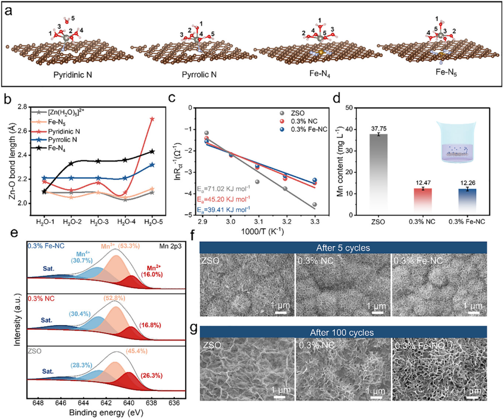 图4. a)吡啶N、吡咯N、Fe-N4、Fe-N5、[Zn(H2O)5]2+之间的结合模型。b)不同N位对不同水分子中Zn─O键键长的影响。c)利用阿伦尼乌斯方程计算的ZSO、0.3%NC、0.3%Fe-NC电解液中MnO2正极的活化能。d)ICP测试ZSO、0.3%NC、0.3%Fe-NC电解液中溶解Mn的含量。e)在ZSO、0.3%NC、0.3%Fe-NC电解液中循环100次后MnO2正极的Mn2p3的非原位XPS。f)5次循环和g)100次循环后ZSO、0.3%NC和0.3%Fe-NC电解质上的MnO2电极的FESEM图。