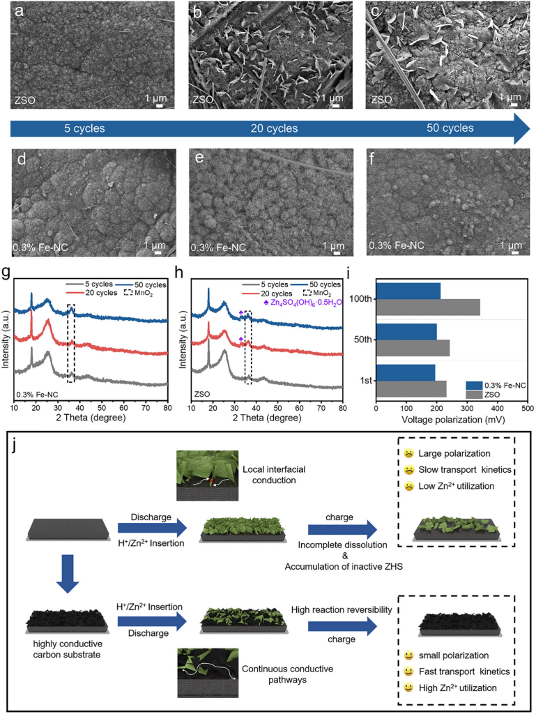 图5. a-c)ZSO和d-f)0.3%Fe-NC电解液中MnO2电极在满充电状态下循环5、20和50次后的FESEM图。g)0.3%Fe-NC和h)ZSO电解液中MnO2电极在满充电状态下循环5、20和50次后的原位XRD。i)0.3%Fe-NC和ZSO电解液中不同循环后半放电容量对应的电压极化。j)副产物可逆沉积/溶解示意图。
