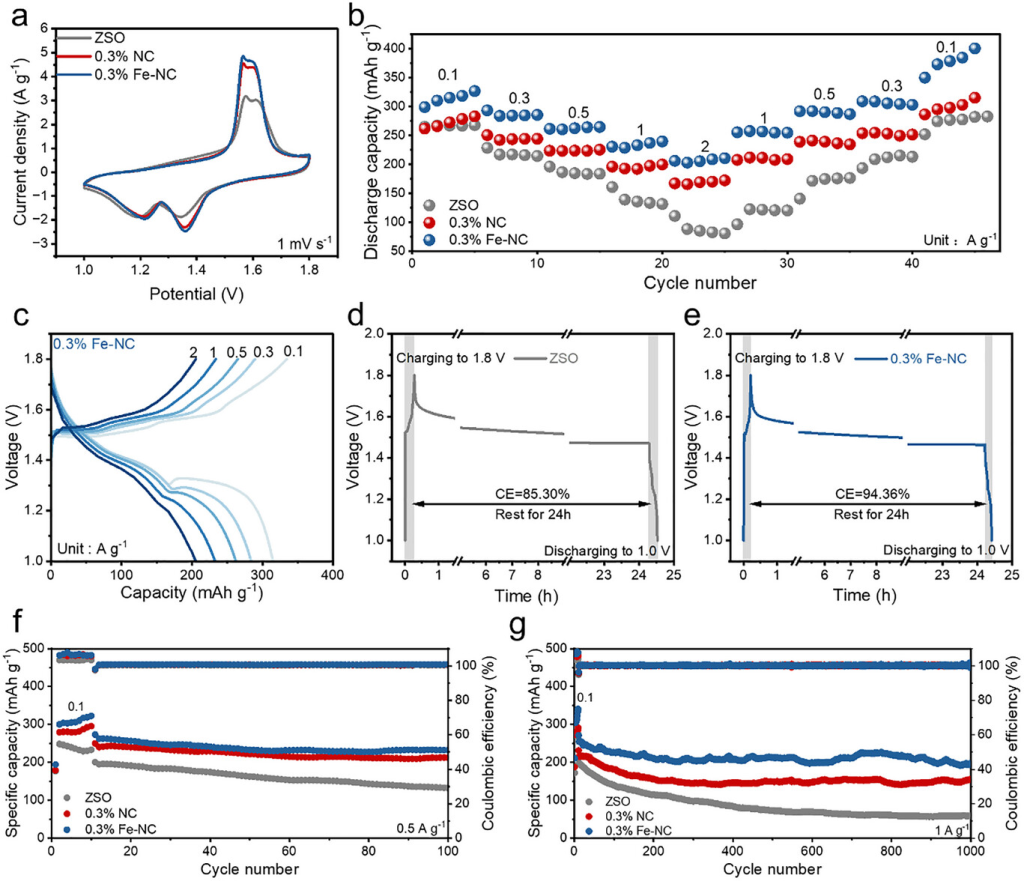 图6. 电化学性能评估。a)不同电解液下Zn/MnO2电池在1mVs−1扫描速率下第3次循环的CV曲线比较。b)水系Zn/MnO2电池的倍率性能考察。c)0.3%Fe-NC电解液中不同电流密度下Zn/MnO2电池的充放电曲线。d)ZSO和e)0.3%Fe-NC不同电解液中电池的自放电行为。分别在f)0.5Ag−1和g)1Ag−1条件下进行循环性能测试。