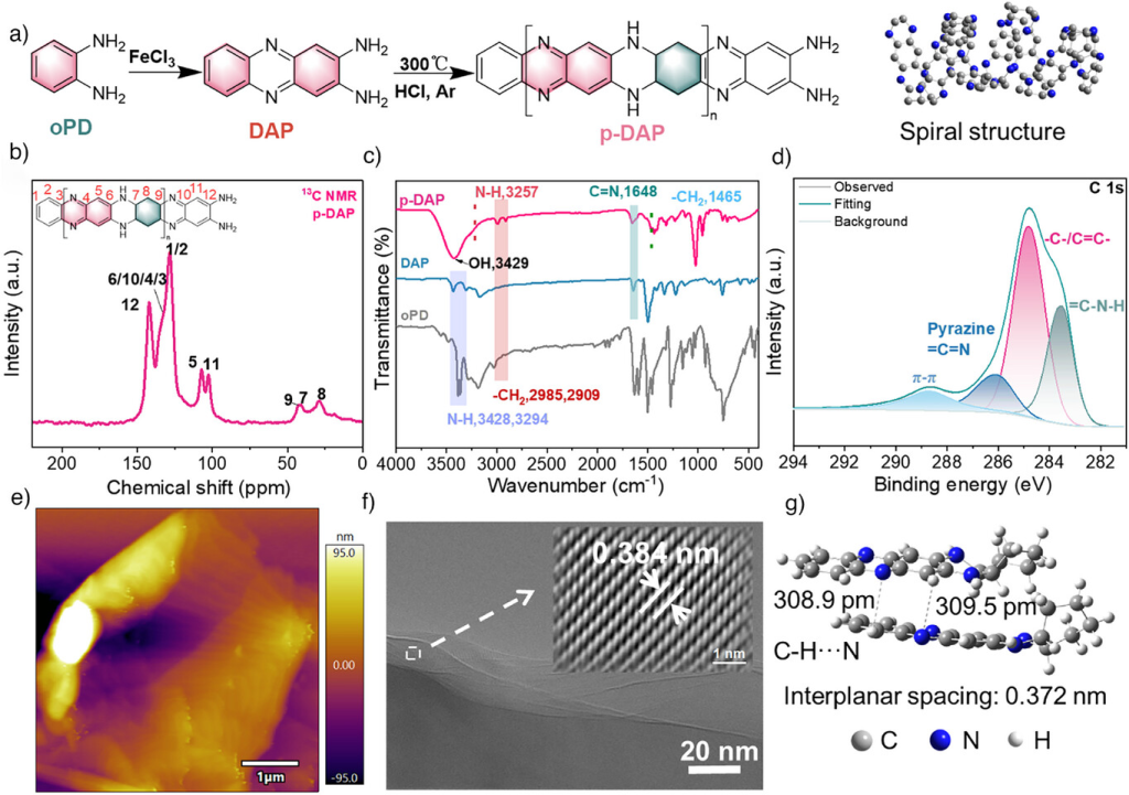 图1. p-DAP的合成与表征。a)p-DAP合成路线图解[插图为计算优化后的分子模型(右)]。b)。p-DAP的固态13CNMR。c)oPD、DAP和p-DAP的FT-IR。d)C1sXPS。e)p-DAP的AFM和f)Cyro高分辨率透射电子显微镜图(插图为使用傅里叶滤波提取的晶格图)。g)层间距由DFT优化结构获得。