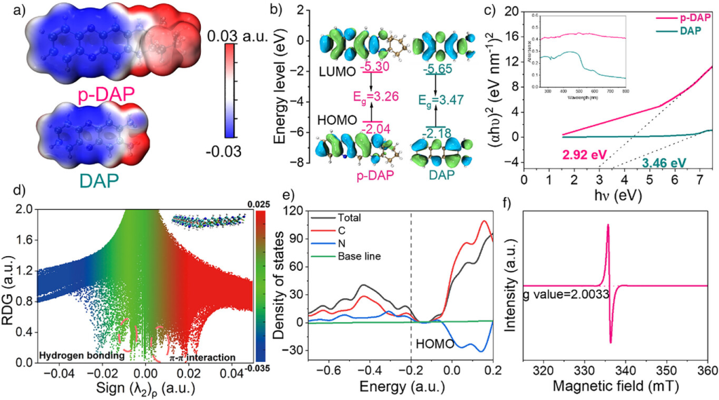 图2. 结构表征。a)DAP和p-DAP的ESP。b)通过DFT计算的DAP和p-DAP的HOMO和LUMO能级。c)DAP和p-DAP的Tauc图(插图为紫外-可见光谱)。d)p-DAP的约化密度梯度与符号(λ2)ρ图。e)p-DAP的总态密度和部分态密度。f)p-DAP的EPR。