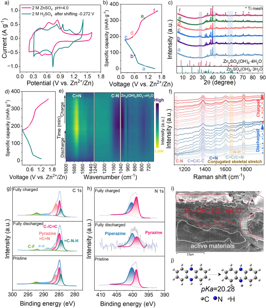 图3. a)p-DAP电极在2MZnSO4和2MH2SO4中以0.5mVs−1的扫描速率进行的CV曲线。b)选择用于原位表征的特殊电压。c)原位XRD图案。d)第一个循环的恒电流充电-放电曲线,记录于e)通过ATR-SEIRAS进行原位FT-IR分析。f)原位拉曼光谱。g)原始、完全放电和完全充电状态下的C1s和h)N1s XPS光谱。i)放电至0.2V的p-DAP电极的SEM-FIB横截面图。j)通过DFT计算的吩嗪的pKa。