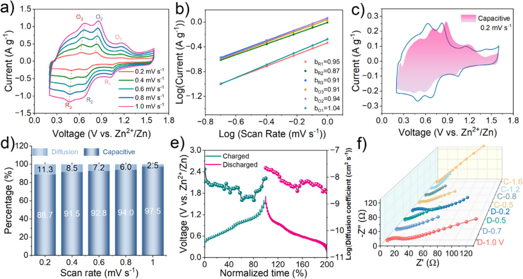 图4. a)不同扫描速率下p-DAP的CV曲线。b)对应log(i,峰值电流)与log(v,扫描速率)关系图。c)p-DAP在0.2mVs−1时的CV曲线(蓝线)及其对应的电容控制电流贡献(粉色阴影区域)。d)不同扫描速率下电容控制和扩散控制的贡献率。e)GITT曲线及对应的扩散系数(D)。f)不同电位状态下的原位EIS。