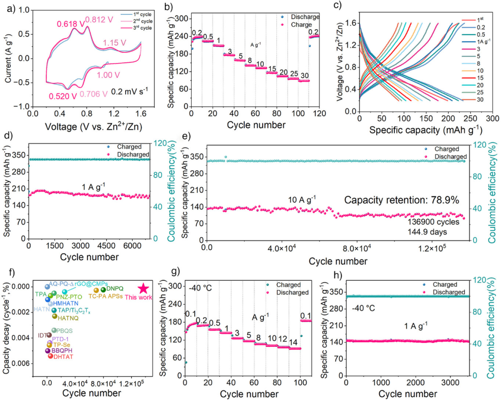 图5. p-DAP//Zn电池的电化学性能。a)电压在0.2–1.6V范围内,以0.2mVs−1的扫描速率循环三次的CV曲线。b)不同电流密度下的倍率性能。c)恒电流放电-充电曲线。d)在1Ag−1的高电流密度下的循环稳定性和库仑效率。e)在10Ag−1下的长期循环稳定性。f)本工作与文献的容量保持率和循环次数的比较。g)在–40°C下使用10mZnCl2电解液的倍率性能。h)在1Ag−1下在–40°C下的长循环性能