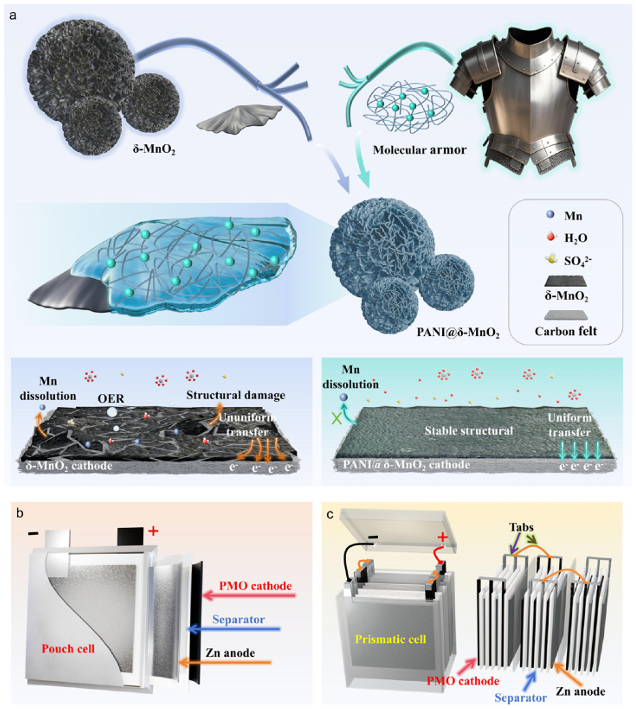图1. (a) PANI分子装甲包裹δ-MnO2正极的大规模生产示意图及其工作机理。(b)Zn-MnO2软包电池示意图和(c)方形电池示意图