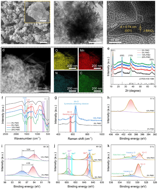 图2.PMO正极材料的结构和形貌表征。(a)10%PMO材料的SEM图。(b)TEM图、(c)HR-TEM图和(d)10%PMO材料的相应EDS元素分布图。(e)不同含量PANI改性的PMO材料的XRD、(f)FT-IR和(g)拉曼。0%PMO和10%PMO材料的(h)N1s、(i)Mn3s、(j)Mn2p和(k)O1s的XPS。