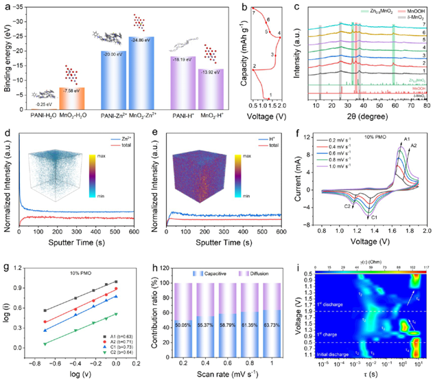 图3.PMO正极的储能机理。(a)H2O、Zn2+和H+分别在PANI和MnO2上的结合能。Zn-PMO电池(b)充放电曲线和(c)相应的PMO正极在不同状态下的XRD,电流密度为0.5Ag–1,电压范围为0.5至1.9V。放电状态下PMO正极中(d)Zn2+和(e)H+在TOF-SIMS溅射体积内的三维分布。(f)不同扫描速率下Zn-PMO电池的CV曲线。(g)log(v)对log(i)的线性图及拟合。(h)电容对总容量的贡献。(i)Zn-PMO电池充放电过程中相应DRT的云图