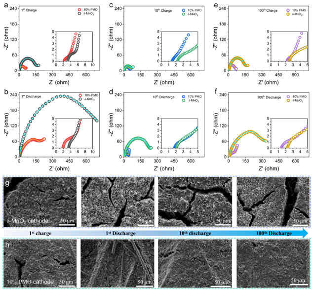 图4.采用不同正极材料的电池在不同充放电循环下的Nyquist图:第1次循环(a)充电和(b)放电状态,第10次循环(c)充电和(d)放电状态,第100次循环(e)充电和(f)放电状态。(g)δ-MnO2正极和(h)10%PMO正极在不同循环阶段后的SEM图。
