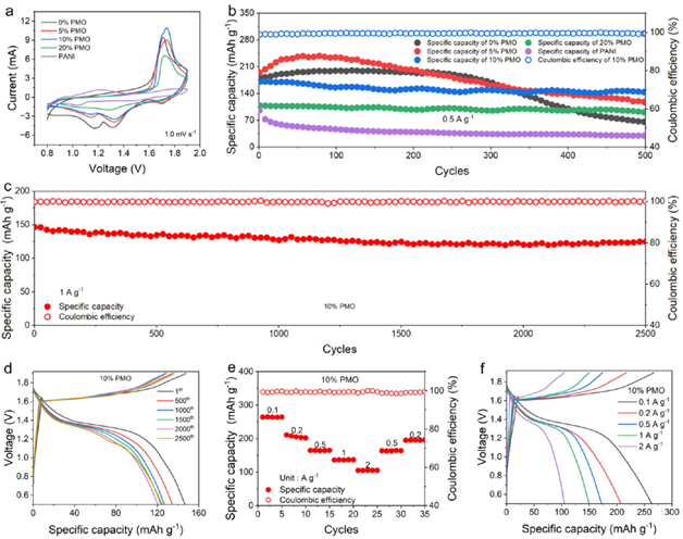 图5.Zn-PMO电池的电化学性能。(a)扫描速率为1mVs–1时不同PMO正极的CV曲线。(b)电流密度为0.5Ag–1时不同正极的循环性能。(c)电流密度为1Ag–1时10%PMO正极的长期循环性能和(d)不同循环的充电/放电曲线。(e)10%PMO正极在不同电流密度范围(0.2至2Ag–1)下的倍率容量。(f)10%PMO正极在不同电流密度范围(0.1至2Ag–1)下的充电/放电曲线。(f)10%PMO正极在不同电流密度范围(0.2至2Ag–1)下的倍率容量。