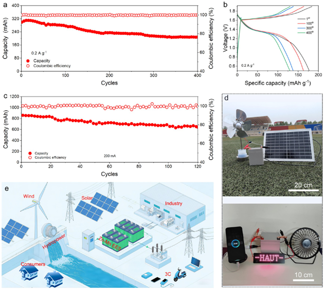 图6.放大版Zn-PMO软包电池和方形电池在实际储能应用中的电化学性能。(a)300mAh容量Zn-PMO软包电池的长期循环性能和(b)不同循环下的充电/放电曲线。(c)900mAh软包电池的长期循环性能。(d)风能和太阳能充电的Zn-PMO方形电池的多方面应用演示。(e)Zn-PMO方形电池在未来智能电网中的应用。