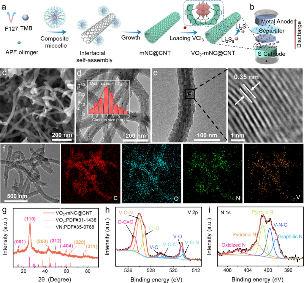 图1.(a)VO2-mNC@CNT制备示意图。(b)锂硫电池示意图。(c)SEM,(d)TEM,(e)HRTEM,(f)带有C、N和V元素映射的STEM图,(g)XRD,以及(h)V2p和(i)VO2-mNC@CNT的N1s的高分辨率XPS。
