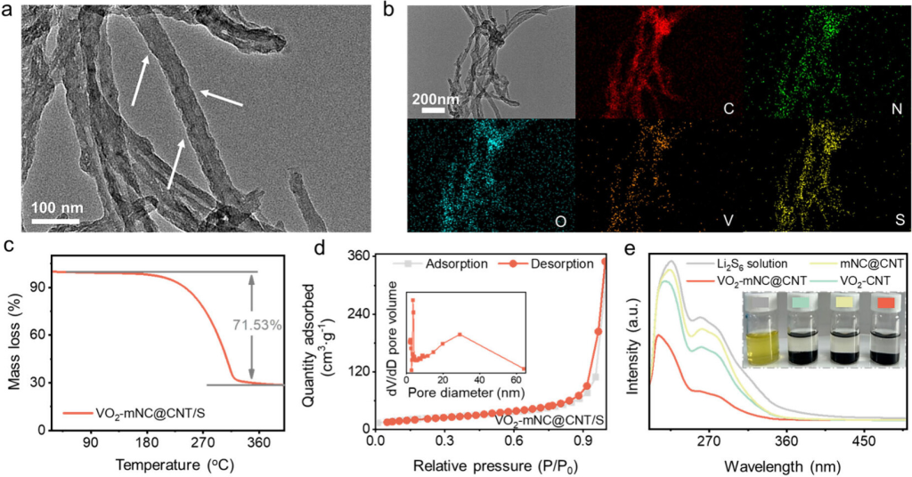 图2.(a)VO2-mNC@CNT/S的STEM图和(b)相应的元素映射。(c)VO2-mNC@CNT/S的热重曲线。(d)VO2-mNC@CNT/S的N2吸附-解吸等温线,插图为VO2-mNC@CNT/S的孔径分布曲线。(e)含有和不含主体材料的Li2S6溶液的UV-vis吸附光谱,插图为引入不同主体材料后的颜色变化。