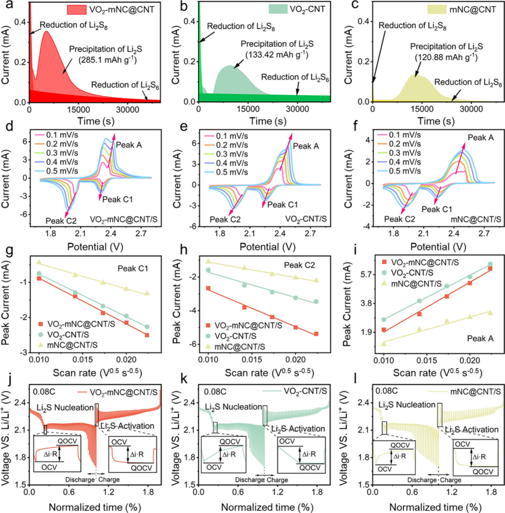 图3.Li2S8在(a)VO2-mNC@CNT、(b)VO2-CNT和(c)mNC@CNT基底上的恒电位放电曲线。(d)VO2-mNC@CNT/S、(e)VO2-CNT/S和(f)mNC@CNT/S正极的LSB在1.7至2.8V范围内以0.1至0.5mVs-1不同扫描速率下的CV曲线,以及(g-i)峰C1、峰C2和峰A的峰电流随扫描速率平方根变化的拟合曲线。(j)VO2-mNC@CNT/S、(k)VO2-CNT/S和(l)mNC@CNT/S基LSB的恒电流放电曲线。