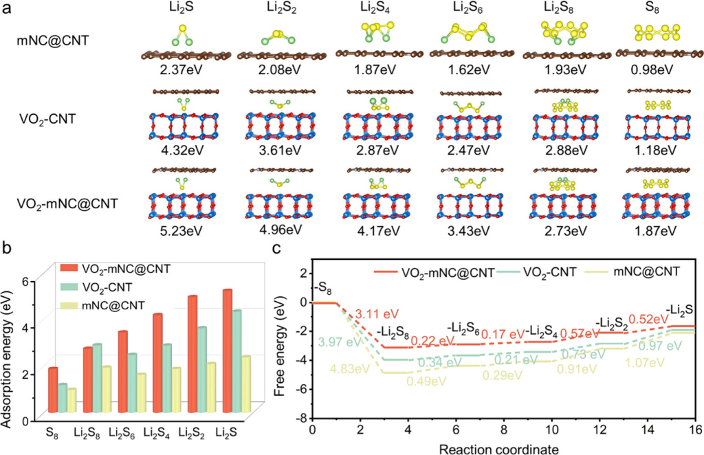 图4.(a)Li2S、Li2S2、Li2S4、Li2S6、Li2S8和S8的优化几何形状和(b)LiPSs在mNC@CNT、VO2-CNT和VO2-mNC@CNT表面的相应吸附能,蓝色、棕色、红色、灰色、黄色和绿色球分别代表V、C、O、N、S和Li原子。(c)LiPSs在mNC@CNT、VO2-CNT和VO2-mNC@CNT上还原的能量分布。