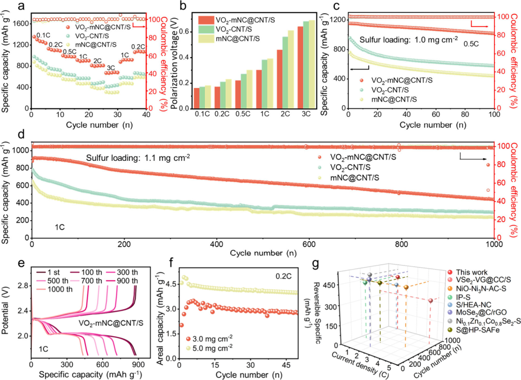 图5.(a)不同电流密度下的倍率性能。(b)不同倍率下的极化电压。(c)0.5C下的循环性能和库仑效率。(d)具有mNC@CNT/S、VO2-CNT/S和VO2-mNC@CNT/S正极的LSB在1.0C下循环1000次。(e)使用VO2-mNC@CNT/S正极在1.0C下循环1、100、300、500、700、900和1000次的电压曲线。(f)基于VO2-mNC@CNT/S的LSB的高硫负载测试。(g)与其他先前报道的作品的比较。