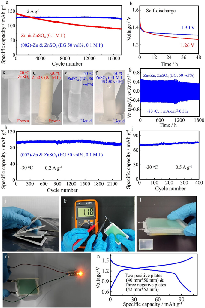 图6.(a)室温下以2Ag–1运行的Zn–I2电池的循环稳定性;(b)充满电后闲置48小时的Zn–I2电池的自放电性能;(c-f)电解液抗冻性:(c)1MZnSO4;(d)1MZnSO4和0.1MI–;(e)1MZnSO4和EG(50vol%);(f)1MZnSO4和0.1MI–和EG(50vol%)。(g)使用1MZnSO4和EG(50vol%)电解液的Zn对称电池的电压曲线,在−30°C和1mAcm–2/0.5mAhcm–2下测试;在−30°C下以(h)0.2Ag–1和(i)0.5Ag–1运行的改进型Zn–I2电池的循环稳定性;使用方形外壳的改进型Zn–I2电池:(j)具有两个正极板和三个负极板的配置;(k)开路电压为1.18V;(l、m)通过将板放入外壳中来组装电池并展示组装电池的良好运行;(n)组装电池的充电/放电曲线。