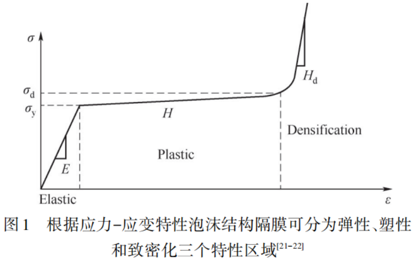 由于隔膜的多孔结构和材质特性,受到压力作用时会产生较大形变,其离子电导率会随着压力产生变化。Gibson等利用多孔膜渗透率随压力变化的函数,建立了基于多孔膜弹性区和致密区渗透率的物理复合模型,为研究隔膜在应力作用下离子电导率等性能的变化提供了参考。Gioia等将隔膜模拟为多孔泡沫结构,利用聚氨酯泡沫膜的数码图像,研究了隔膜的力学响应。Sarkar等根据上述膜形变与压力的关系曲线将多孔膜的受压过程分为三个阶段,即弹性(Ⅰ)、塑性(Ⅱ)和致密化(Ⅲ)阶段(图1)。