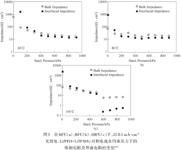 聚合物电解质基体材质与隔膜同为聚合物,受压后的表现与聚烯烃隔膜类似。Gupta 等研究了不同温度及外加压力下PEO基的Li/PEO-LiTFSI/Li对电池界面电阻和体相电阻的变化。如图3所示,在60℃和80℃,界面阻抗随着压力的增加呈现递减趋势,分别在400kPa和200kPa后电阻趋于稳定,此时,压力为临界约束压力值。